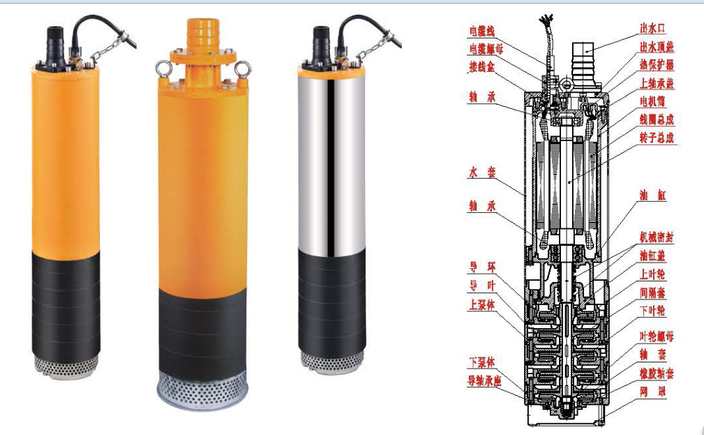 QXN型内装式潜水电泵由水泵、密封、电动 机、冷却水套组成,电动机位于电泵上部,为三相异步电动机;水泵位于电泵下部,为多级离心式叶轮径向导叶结 构;水泵与电机之间采用两道独立的耐磨机械密封,各固定止口密封处采用"O"形耐油橡胶密封圈作静密封;电动机外套有钢制冷却水套,电泵工作时,水流从水套和电动机之间空隙通过,对电动机和轴承有良好的冷却作用, 因此电泵上部可以露出水面工作。电泵转轴经镀硬铬处理, 不易磨损、腐蚀,且便于叶轮的 维修拆卸。具有电泵结构紧凑、体积小、移动方便,具有扬程高、抽干彻底等优点。
