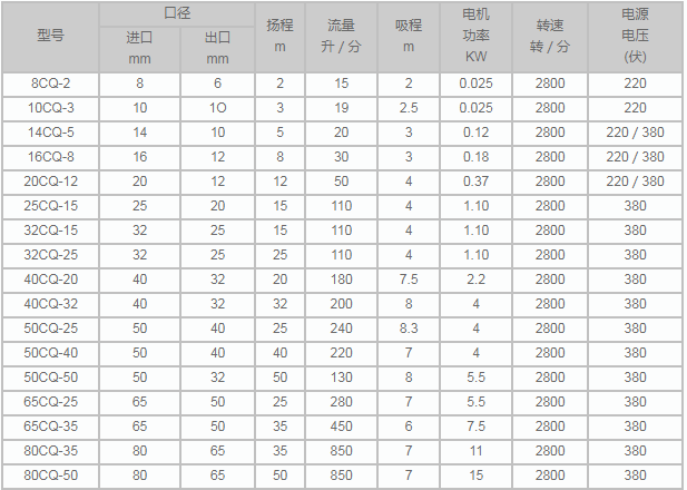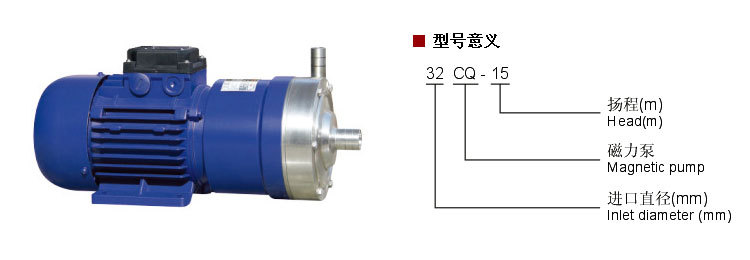(1)工程塑料磁力泵(增强聚丙烯)型号有:8CQ—2、10CQ—3、14CQ—5、16CQ—8、20CQ—12、32CQ—15、40CQ—20、50CQ—25、50CQ—32、65CQ—32。