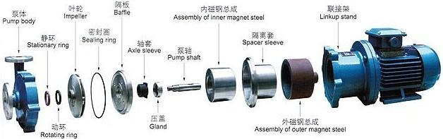 不锈钢磁力泵由不锈钢泵、磁力传动器、电动机三部分组成。关键部件磁力传动器由外磁转子、内磁转子及不导磁的隔离套组成。