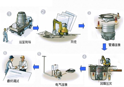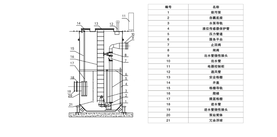 预制泵站为整体安装;泵站内设备入泵、格栅维护时如需进入筒体内,直接由顶部吊进吊出;内部管道系统则在泵站内设有检修平台和上下爬梯。